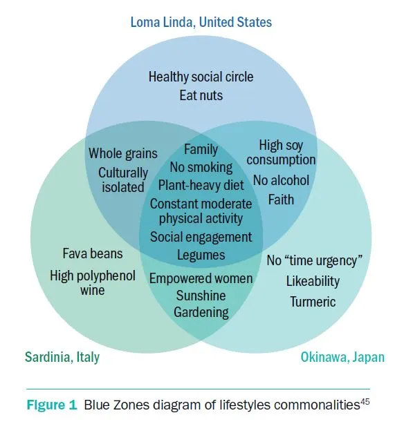 Plant-based dietary patterns are common among longer-lived populations, illustrated by those living in “Blue Zones,” a phrase coined by author Dan Buettner in his 2008 book to describe five places around the world where residents have the greatest longevity. His project aimed to find commonalities among them and found they shared particularly healthful plant-based eating patterns.41 The original Blue Zones identified included Okinawa, Japan; Ogliastra, Sardinia; Loma Linda, California; Ikaria, Greece; and the Nicoya Peninsula of Costa Rica. Though their lifestyles differ, they all share certain lifestyle traits that enhance and prolong their lives. They include diet, built-in routine exercise, social and familial connection, and living a purposeful life. The dietary component in all Blue Zones is primarily plant-based, (95%)42 with daily legume and local vegetable consumption, providing high levels of fiber and phytonutrients that protect against chronic disease. We will highlight three examples from the “Blue Zone” regions to identify the lifestyle practices that support longevity and illuminate their commonalities to better understand how modifiable lifestyle factors may be addressed within the scope of medical practice.