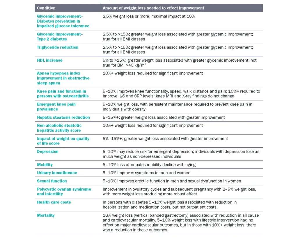 Obesity treatment is multi-modal and, depending on BMI cutoffs, may include medication and surgery, endoscopic procedures, and very low-calorie diets. Lifestyle medicine and behavioral therapy are the foundation of obesity treatment. The United States Preventive Services Task Force recommends intensive, multicomponent behavioral intervention for all individuals with obesity.36 These programs include at least 12 sessions in the first year, weekly or even twice per week.36 Many are modeled after the Diabetes Prevention Program (DPP).37 It is important to understand all options available to treat obesity because simply telling a patient they have obesity and must lose weight has been shown to be ineffective for weight loss.38 In fact, telling a patient they need to lose weight without providing adequate treatment can increase obesity stigma, which has been shown to worsen weight loss outcomes. Clinicians should be aware of their own obesity stigma and/or bias, and this implicit or explicit bias should not prevent them from providing all the available options for obesity treatment, including medications and surgery should they be indicated. In addition, being aware of weight bias may help prevent clinicians from exacerbating obesity stigma for patients struggling with obesity.39–42 Obesity treatment should include a behavioral element. In addition to addressing weight bias, behavioral treatment includes a variety of components including collaborative goal setting, problem-solving, planning, stimulus control, social support, addressing emotional eating, self-monitoring, cognitive restructuring, motivational interviewing, relapse prevention, and contingency planning.43