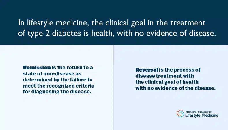 “The American College of Lifestyle Medicine (ACLM) published a position statement in the American Journal of Lifestyle Medicine in June of 2020, “Type 2 Diabetes Remission and Lifestyle Medicine – A Position Statement from the American College of Lifestyle Medicine” that concludes: